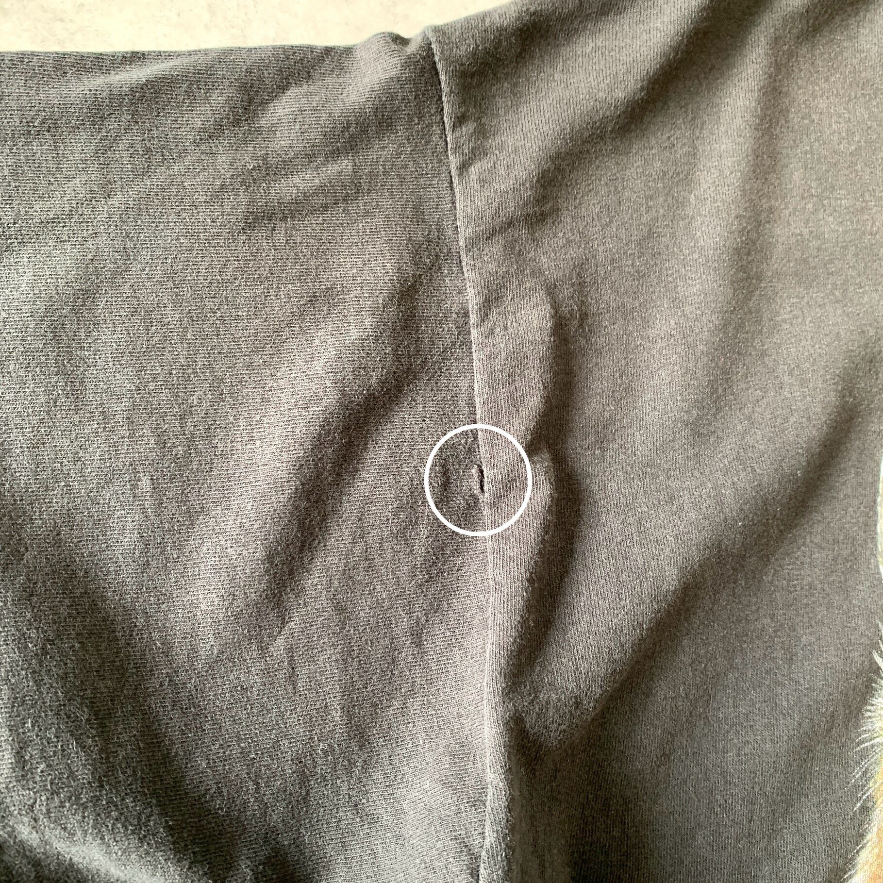 ・左裾の内側縫製のほつれ