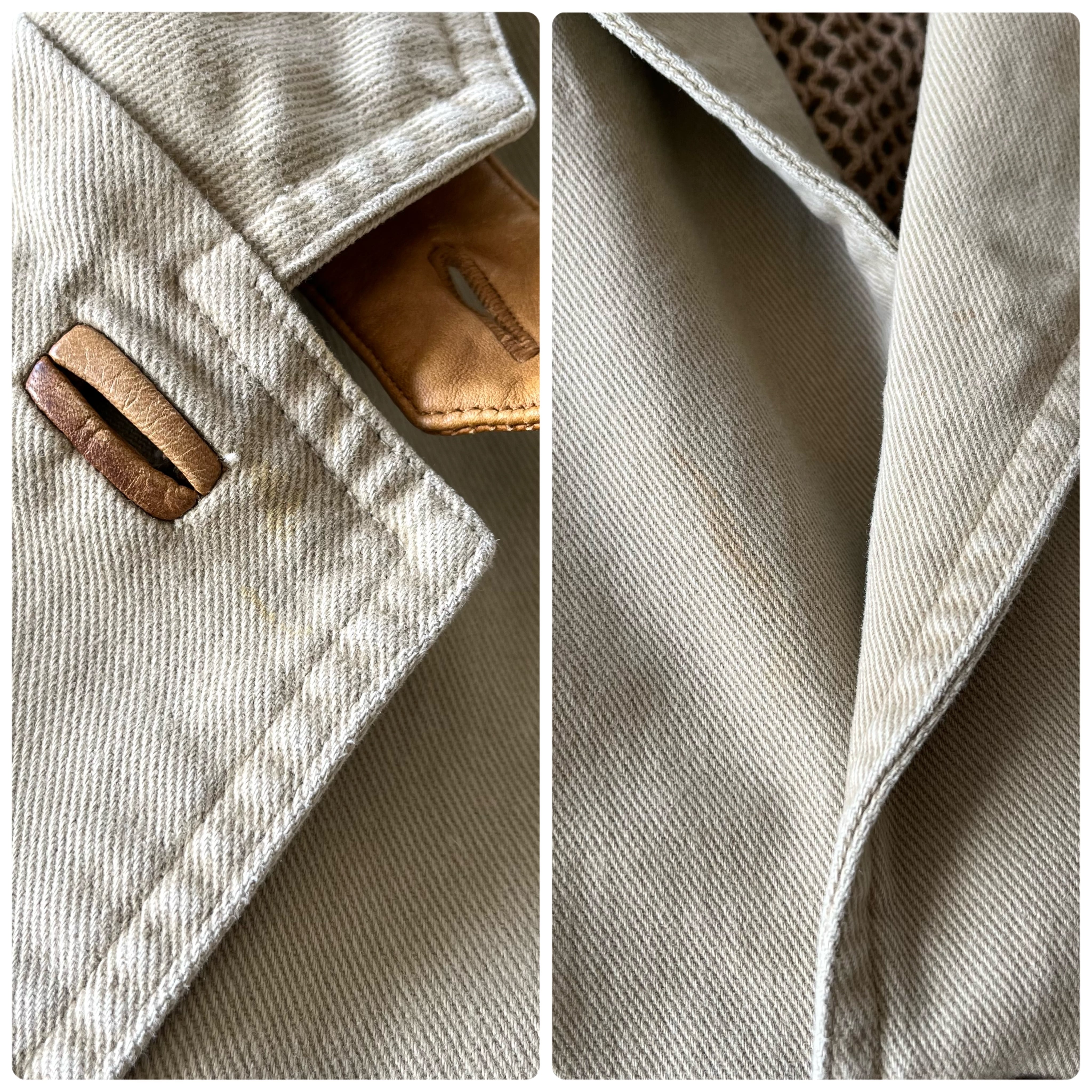 ・1つ1つはそれほど大きく目立つものではないですが、うすいオレンジや茶色っぽい汚れが複数箇所、随所にあります。フロント側と袖が多めです。